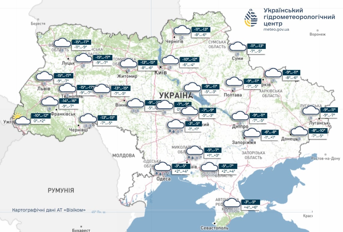 По информации Укргидрометцентра, в конце января ожидается постепенное потепление. Температура будет приближаться к климатической норме, без резких морозов. Осадки станут чаще, но в основном в виде мокрого снега и дождя.