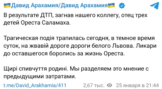 Информацию о гибели парламентария позднее подтвердил глава фракции "Слуга народа" Давид Арахамия. По его словам, врачи до последнего боролись за жизнь депутата.