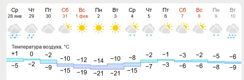 С пятницы, 30 января, в страну начнет заходить мощный антициклон, который принесет затяжные морозы и зимнюю погоду. Пик холода ожидается с 1 по 3 февраля, местами до −24 градусов ночью.