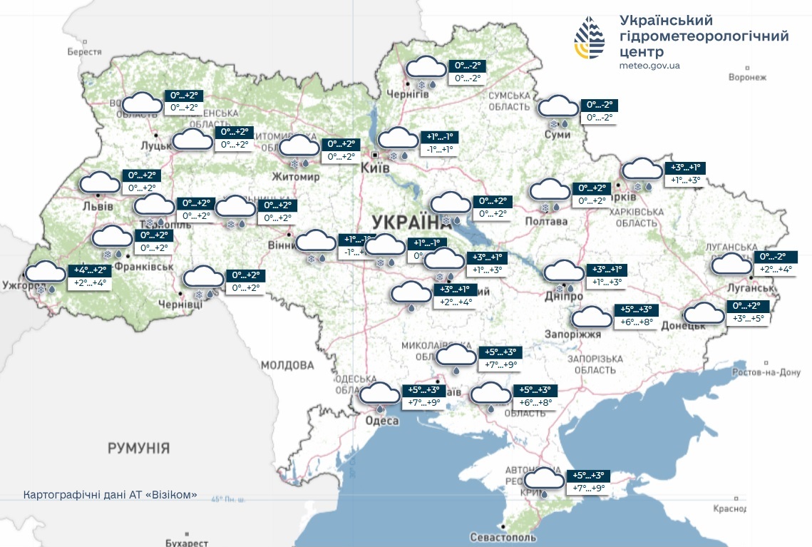 По данным Украинского гидрометеорологического центра, в четверг, 29 января, погода по всей стране останется относительно мягкой, но влажной.