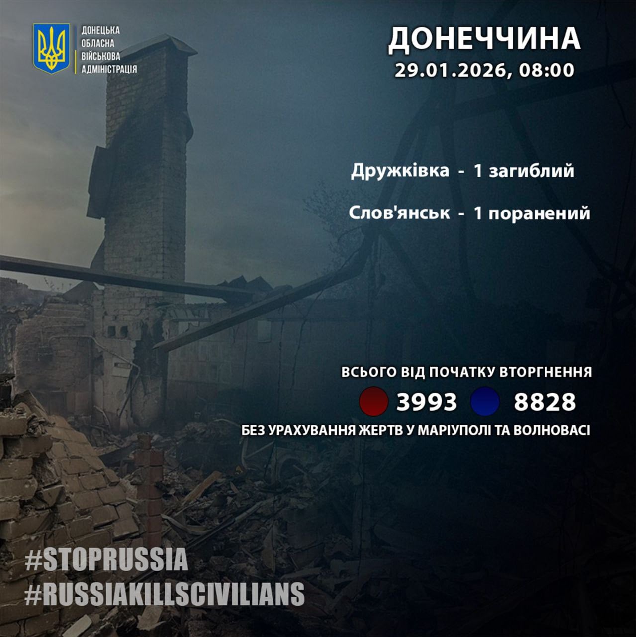 За 28 января россияне убили еще одного жителя Донетчины в Дружковке, также один человек получил ранения.