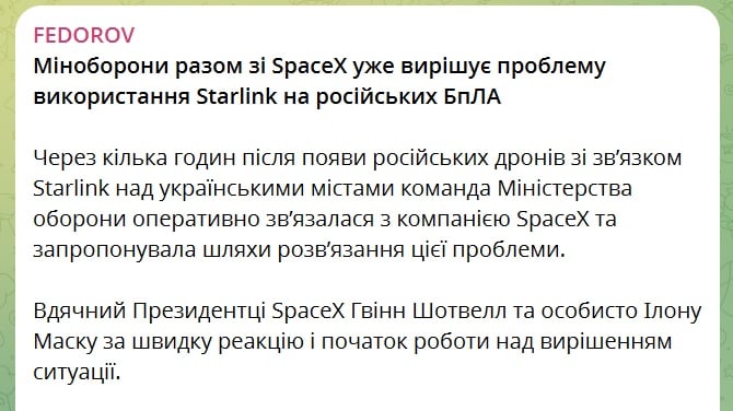 Министр обороны Украины Михаил Федоров заявил, что команда Минобороны оперативно вышла на связь с компанией SpaceX, реагируя на риск использования российскими военными беспилотников со связью Starlink.