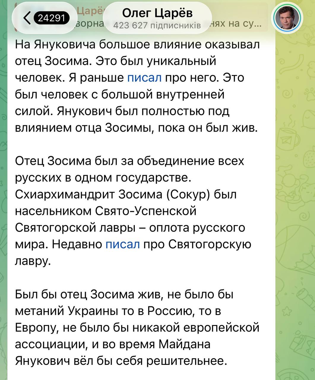 Предавший Украину и перешедший на сторону Москвы Олег Царев опубликовал пост, в котором расказал, что решающее влияние на Виктора Януковича оказывал так называемый отец Зосима — душевнобольной монах Святогорской лавры, известный своими радикально пророссийскими взглядами.
