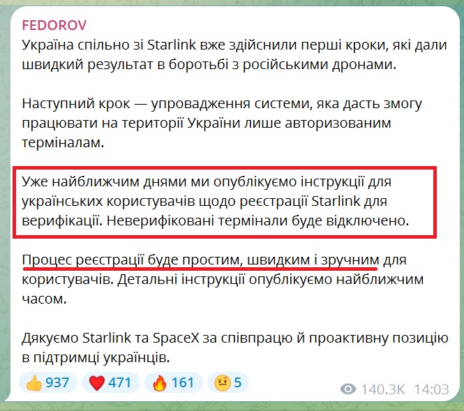 В ближайшие дни украинская сторона опубликует инструкции для пользователей по регистрации терминалов. Процедура будет простой и быстрой, однако обязательной. Это означает, что любые попытки использовать Starlink без подтверждения, в том числе в интересах армии РФ, будут заблокированы.