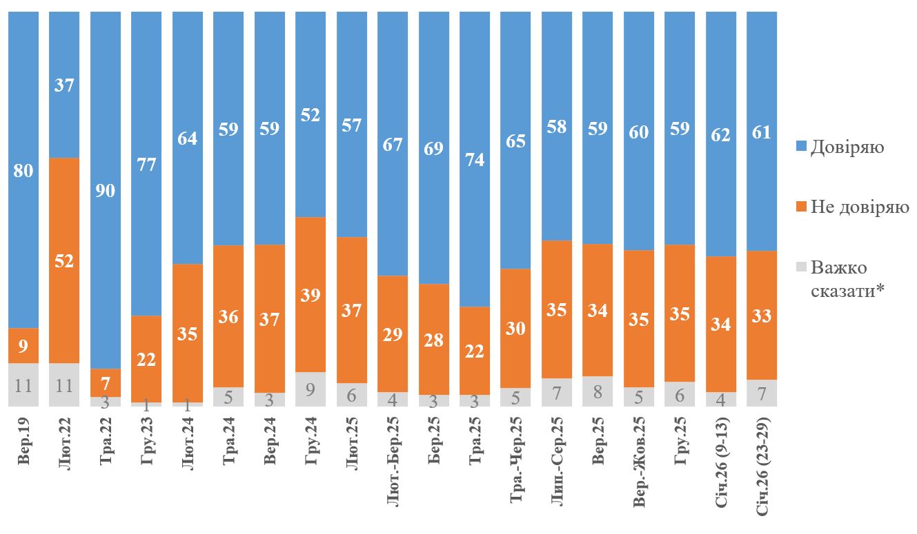 С 23 по 29 января 2026 года Киевский международный институт социологии (КМИС) провел социологическое исследование среди граждан Украины. Методом телефонных интервью (CATI) были опрошены 1003 респондента старше 18 лет, проживающие на территориях, контролируемых украинским правительством. В выборку не включались жители оккупированных регионов и граждане, выехавшие за границу после 24 февраля 2022 года, погрешность результатов не превышает 4,1%.