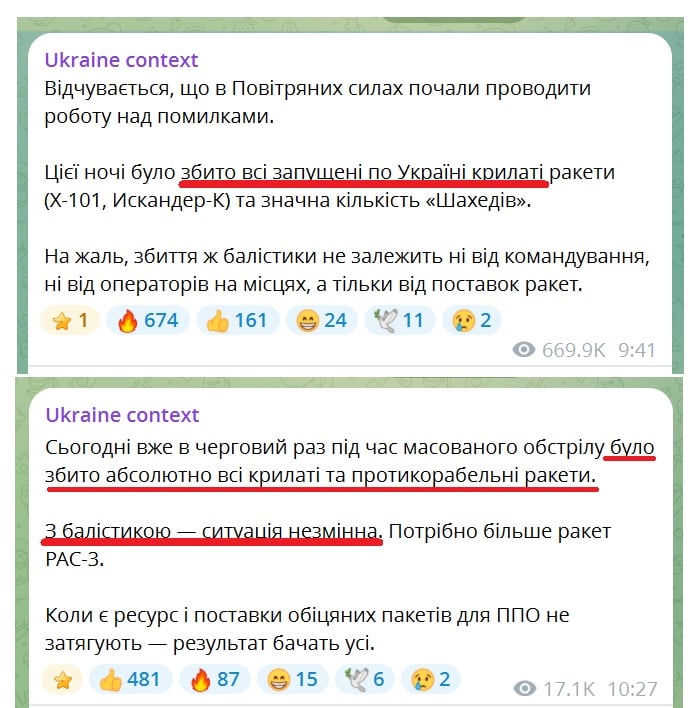 Сообщается, что во время последнего массированного удара украинская ПВО вновь уничтожила абсолютно все крылатые и противокорабельные ракеты. Наблюдатели отмечают, что эффективность работы ПВО заметно выросла, что связывают с адаптацией тактики и "работой над ошибками" в Воздушных силах и приходом Михаила Федорова и его команды на пост министра обороны.