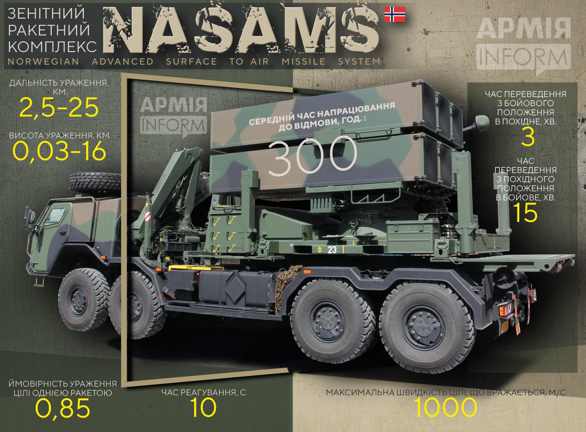 Напомним, NASAMS на вооружении ВСУ появился несколько лет назад. Это норвежский передвижной ЗРК среднего радиуса действия. Норвежская армия приняла его на вооружение в 1994 году. Комплекс использует ракеты AIM-120A. Дальность уничтожения воздушных целей составляет от 2,5 до 25 км. Высота поражения цели – 0,03-16 км. Вероятность поражения цели одной ракетой составляет 0,85.
