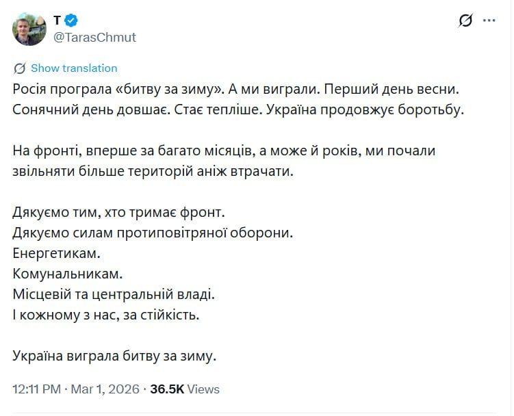Глава фонда "Повернись Живим" Тарас Чмут заявил, что Украина выиграла "битву за зиму", тогда как Россия свою кампанию провалила. Об этом он написал в первый день весны.