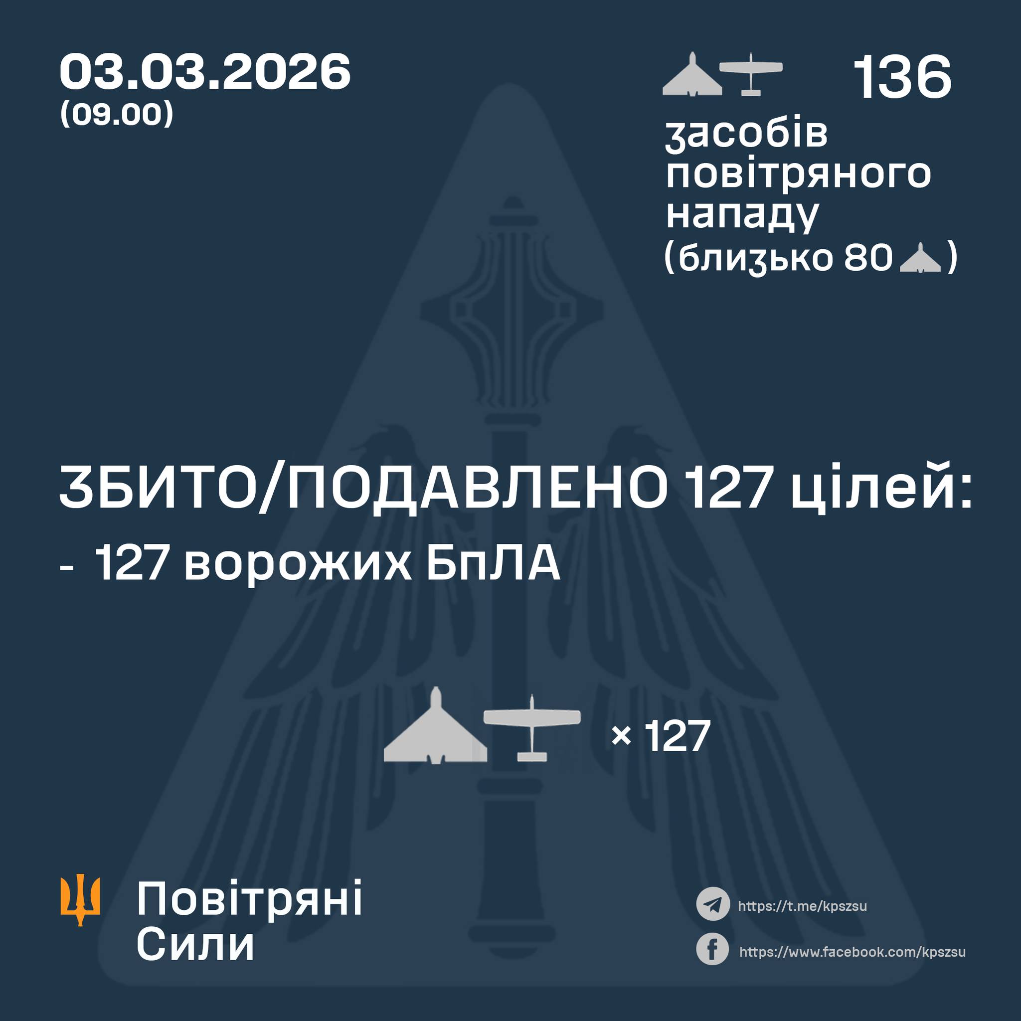 По данным ВС ВСУ, в ночь на 3 марта оккупанты атаковали Украину 136 ударными беспилотниками типов Shahed, "Гербера", "Италмас" и другими (около 80 из них "Шахеды"). Воздушное нападение отражали авиация, зенитные ракетные войска, подразделения РЭБ, беспилотные системы и мобильные огневые группы Сил обороны. По состоянию на 09:00 сбито или подавлено 127 БПЛА на Севере, Юге и Востоке страны.