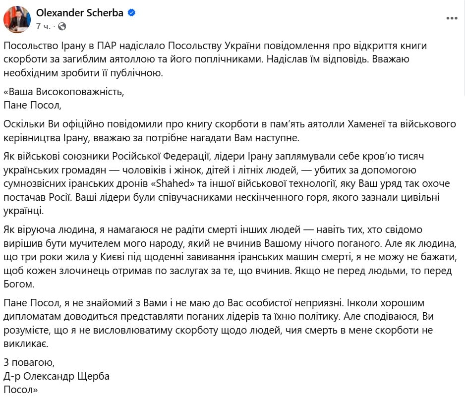 Аналогичное сообщение иранская сторона рассылает и украинским дипломатам за рубежом. Об этом рассказал посол Украины в ЮАР Александр Щерба на своей странице в Facebook.
