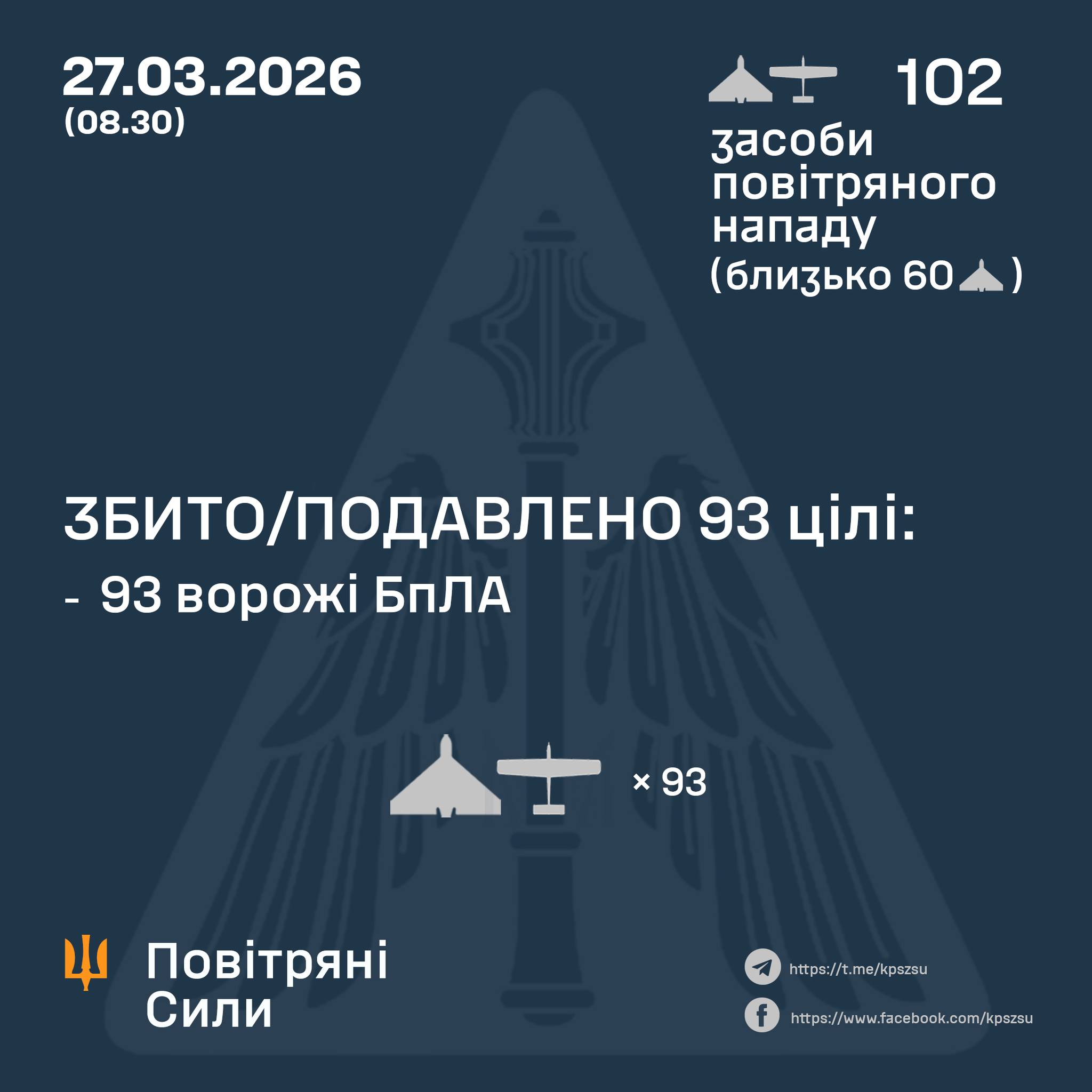 В ночь на 27 марта российские войска вновь атаковали Украину ударными беспилотниками. Начиная с 18:00 26 марта было выпущено 102 дрона различных типов, около 60 из них составляли "Шахеды". По предварительным данным, украинская противовоздушная оборона сбила или подавила 93 вражеских дрона.