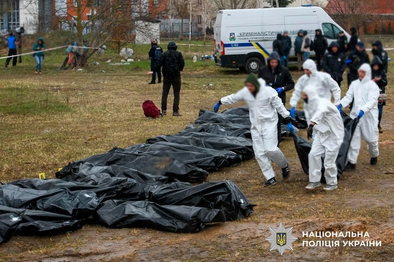 По данным Национальной полиции Украины, расследование военных преступлений РФ позволило собрать доказательства по международным стандартам и установить личности почти всех погибших. В рамках работы следователи раскрыли 124 тяжких преступления, среди которых 84 убийства и 40 фактов жестокого обращения с гражданскими. Подозрения объявлены 97 российским военным, из них 59 — уже официально, среди них десять командиров. В суд направлены обвинительные акты против 46 фигурантов. Идентифицировано 98,3 % жертв, тела которых переданы семьям. Отдельная группа полиции продолжает расследовать исчезновение более пятидесяти жителей города, вывезенных за пределы Украины.