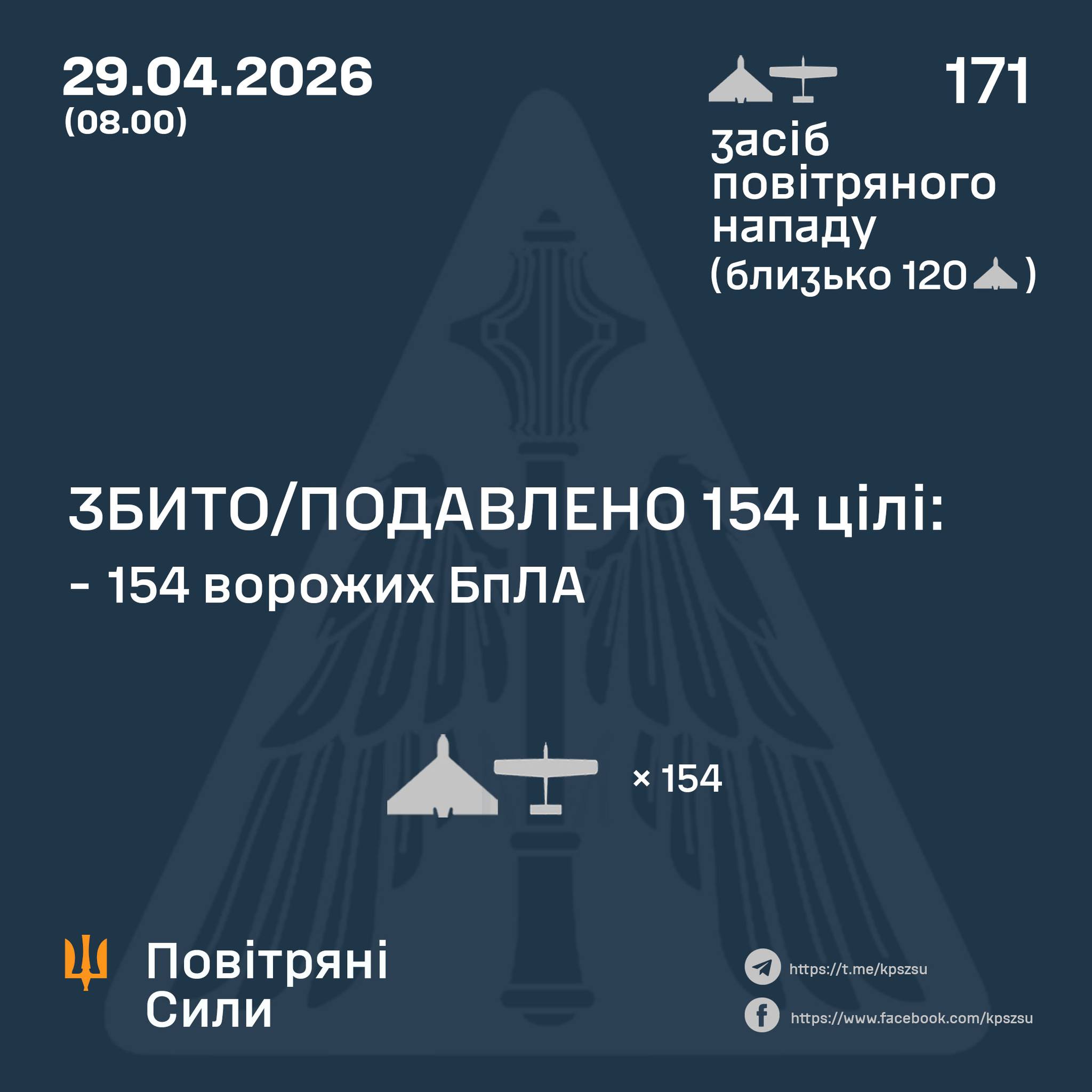 По информации командования ВС ВСУ, всего за ночь армия РФ выпустила по Украине 171 ударный БПЛА разных типов, украинские силы ПВО сбили или подавили 154 дрона.