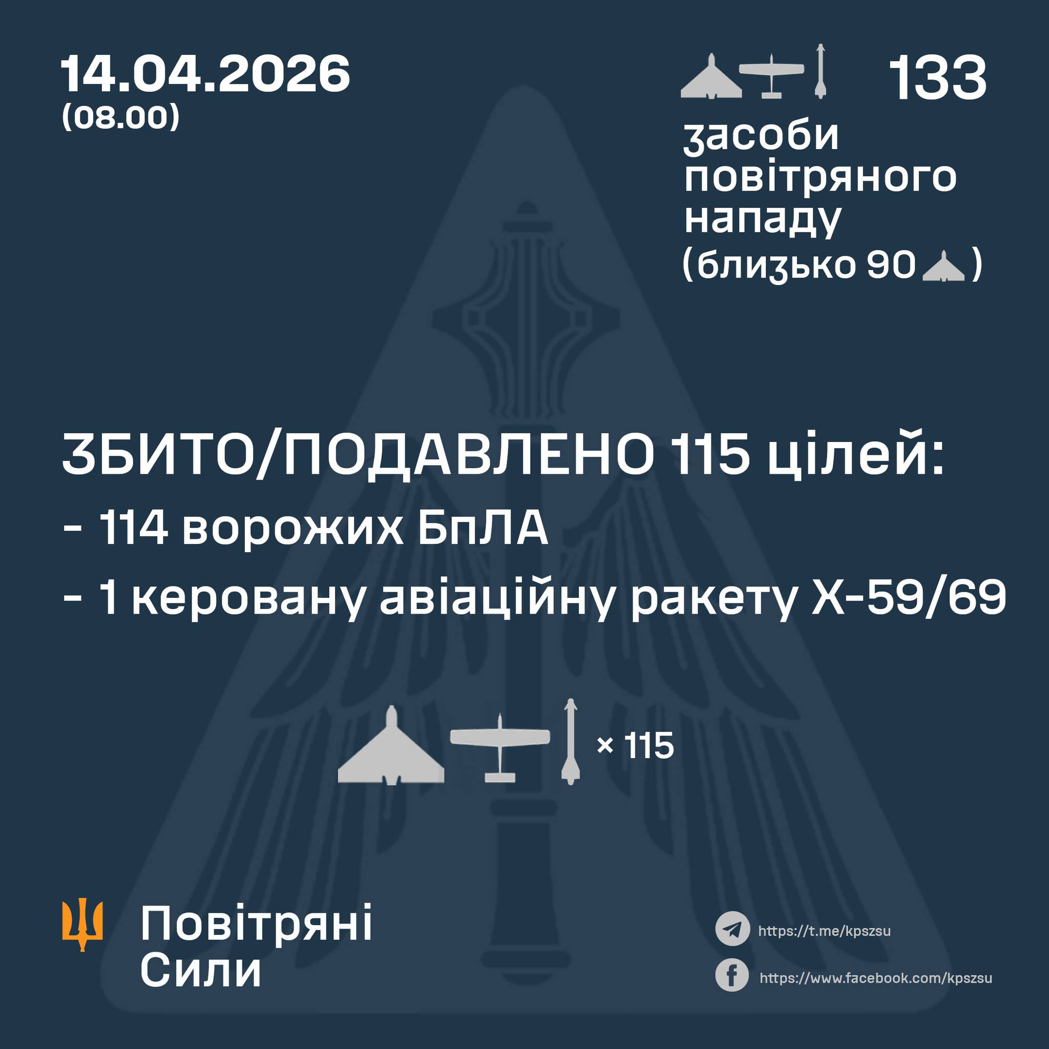 По данным ВС ВСУ, в ночь на 14 апреля армия РФ выпустила по Украине четыре управляемые ракеты "Х-59" / "Х-69" и 129 ударных БПЛА разных типов, ПВО сбила или подавила одну ракету и 114 беспилотников.