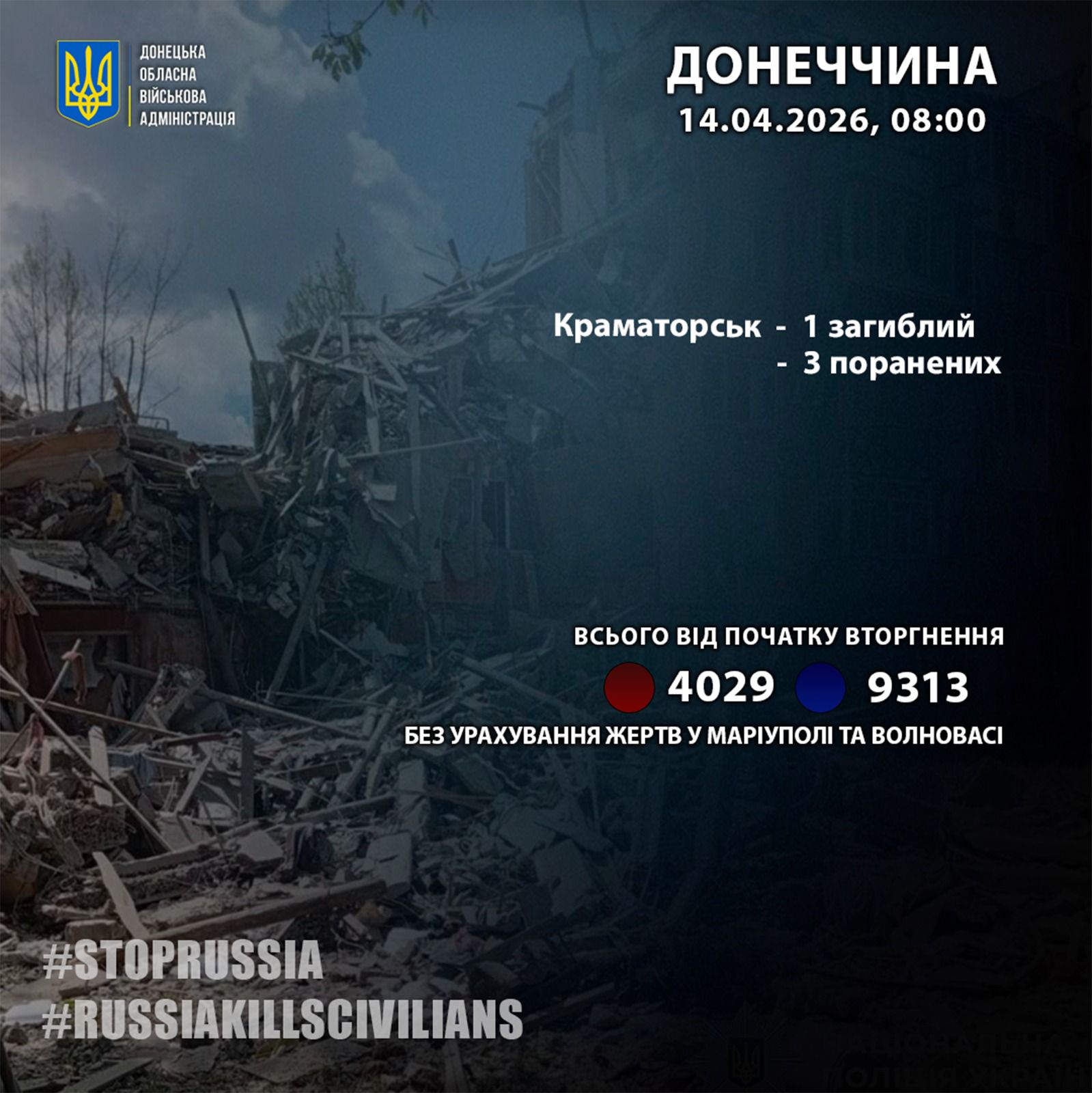 По информации главы Донецкой ОВА Вадима Филашкина, в Краматорске в результате атаки российских беспилотников один человек погиб, трое получили ранения.