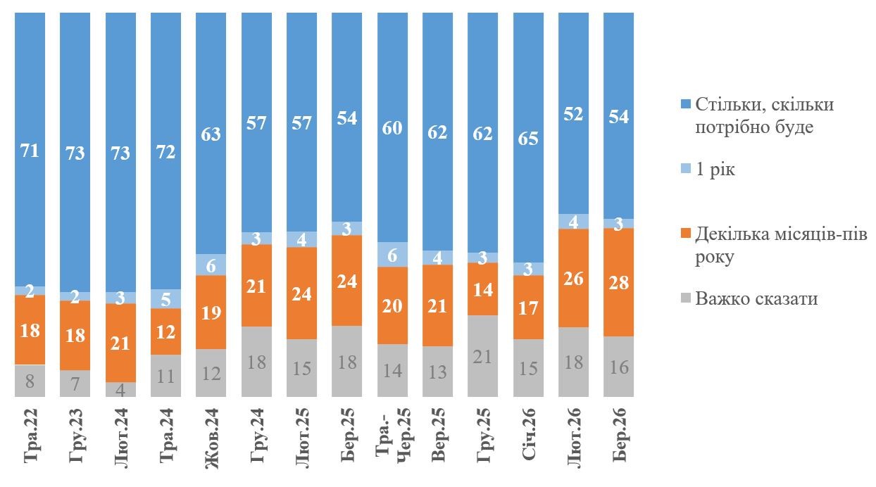 54% украинцев заявили, что готовы терпеть войну столько, сколько потребуется, 28% допускают продолжение боевых действий от нескольких месяцев до полугода, а 3% — около года.