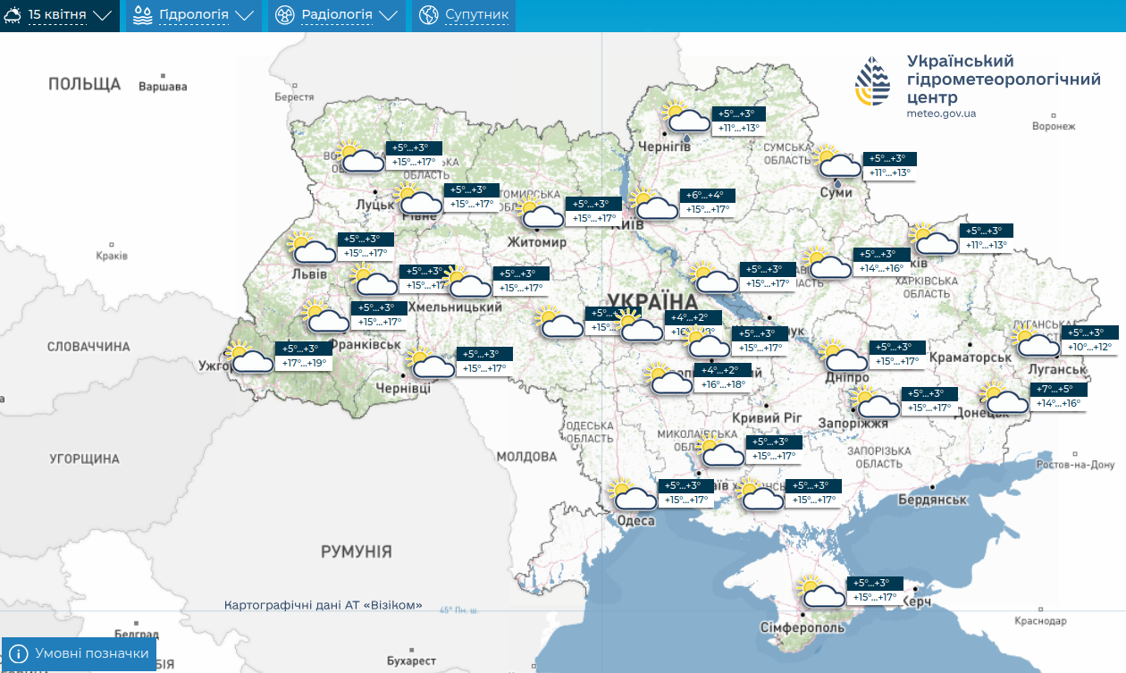 В среду, 15 апреля, почти вся Украина будет под действием западного антициклона. Будет тепло, солнечно и сухо. И только северо-восток страны будет с циклоном.