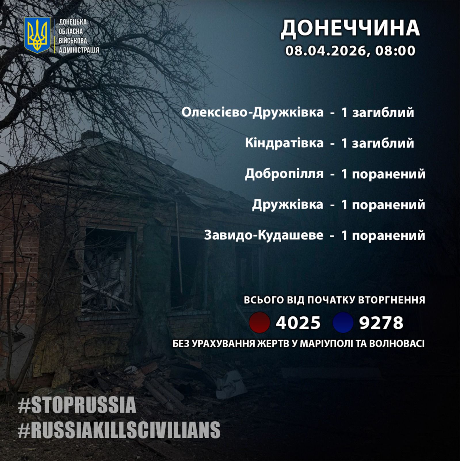 По информации руководителя Донецкой ОВА Вадима Филашкина, 7 апреля в результате обстрелов российскими войсками в Донецкой области погибли два человека в Кондратовке и Алексеево-Дружковке, ранения получили три мирных жителя.