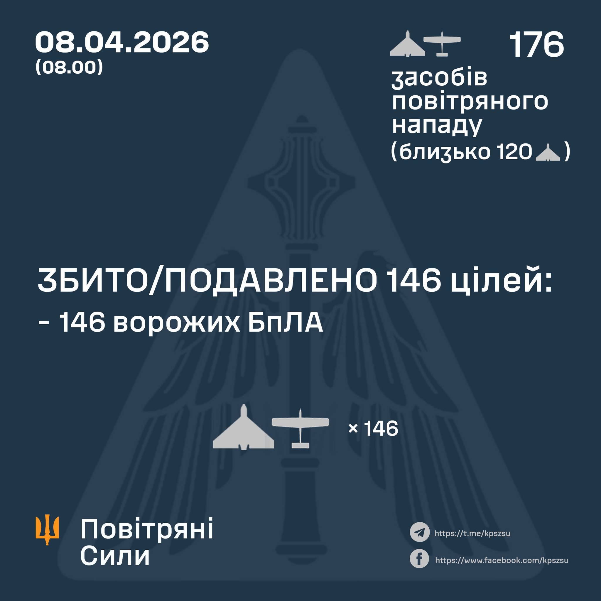 По данным Воздушных сил ВСУ, в ночь на 8 апреля силы ПВО сбили или подавили 146 из 176 вражеских беспилотников. Зафиксированы попадания 24 дронов в 14 локациях и падение обломков в одной.