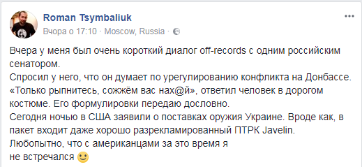 Один из известных украинских журналистов Роман Цымбалюк, который работает в Москве спецкорреспондентом, написал в соцсети про свой непубличный разговор с одним из российских сенаторов.