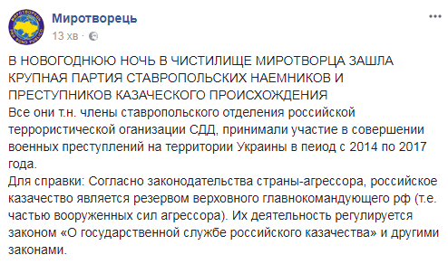 В новогоднюю ночь в "Чистилище" "Миротворца" зашла большая партия ставропольских наемников и преступников казацкого происхождения