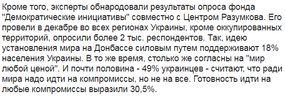 Наиболее неприемлемым для наших сограждан оказалось проведение выборов в Донбассе на условиях боевиков и полная амнистия участников незаконных вооруженных формирований. Не снискали поддержки среди украинцев и идеи формирования местной полиции, судов и прокуратуры на Донбассе с исключительно местных представителей и предоставления русскому языку статуса второго государственного. О мерах, которые будут способствовать миру, опрошенные поддержали санкции ЕС и США против России, введение миротворцев ООН, укрепление Вооруженных сил и проведения операций по освобождению оккупированных территорий.