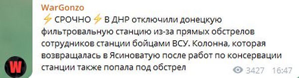 Одним из первых о прекращении работы станции сообщил российский пропагандист, сотрудник скандального ресурса Lifenews Семен Пегов на своем telegram-канале. С его слов, работа ДФС парализована из-за “прямых обстрелов”, в которых пособник террористов по традиции обвинил украинские войска. Он также добавил, что под этот обстрел попала и возвращавшаяся в оккупированную Ясиноватую колонна с работниками, которые консервировали станцию. По всей видимости, в этот раз никто не пострадал.