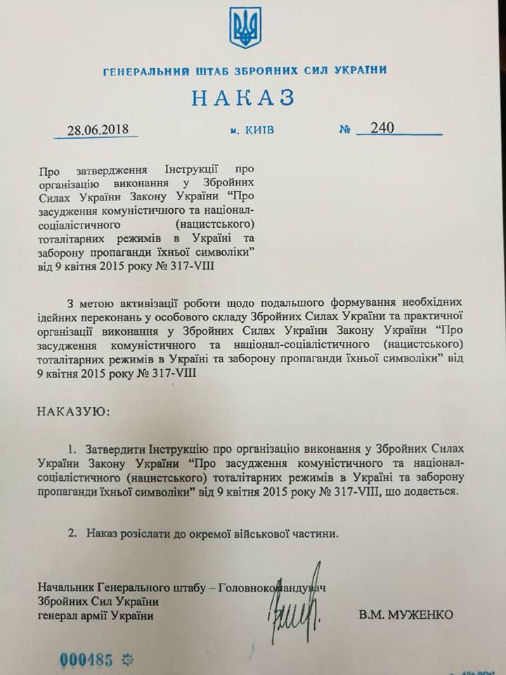 Так, он напомнил, что у украинской армии есть свои славные традиции, которые воины чтят и продолжат чтить в будущем. Чтобы избавиться от остатков советчины в армии, Муженко подписал указ об окончательной декоммунизации ВСУ.