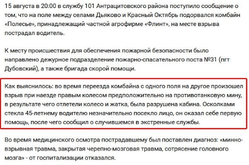 Как стало известно, вчера, 15 августа, в оккупированном группировкой "ЛНР" Антрацитовском районе в результате подрыва на боеприпасе был подорван комбайн "Полесье" в месте с находившимся за рулем водителем, передает "Диалог.UA".