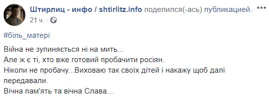 Короткое сообщение в Facebook убитой горем матери украинского Героя не оставило равнодушным украинцев, передает "Диалог.UA".