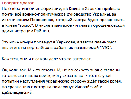 Пропагандист заявил о появлении у него неких "оперативных данных" о том, что сегодня, 15 декабря, в Харьков якобы прибыло "все военно-политическое руководство Украины за исключением президента Порошенко". Последнего заменил глава его же администрации Райнин. Уже завтра, уверяет Долгов, эта делегация якобы отправится на вертолетах на Донбасс "в зону АТО" готовить наступление.