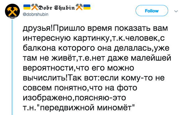 "Пришло время показать вам интересную картинку, так как человек, с балкона которого она делалась, уже там не живет, и нет даже малейшей вероятности,что его можно вычислить!" - отметил @dobrshubin, уточнив, что кадр сделан на площади Бакинских комиссаров в Донецке.