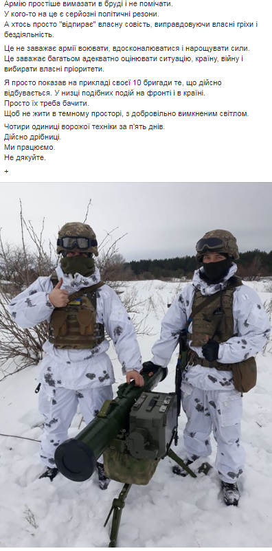 "Десятой горно-штурмовой бригаде удалось за 5 дней уничтожить 4 единицы техники российских оккупантов. На сленге военных, как говорится, "заПТУРили". Четыре выстрела, четыре ракеты – четыре попадания. Мы сделали это с помощью украинского комплекса "Стугна"", - отметил в самом начале Бабич.
