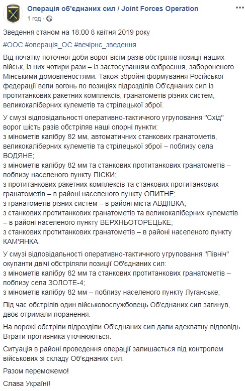 В понедельник, 8 апреля, боевики восемь раз открывали огонь в районе ООС, в результате которого погиб один боец и один военнослужащий погиб.
