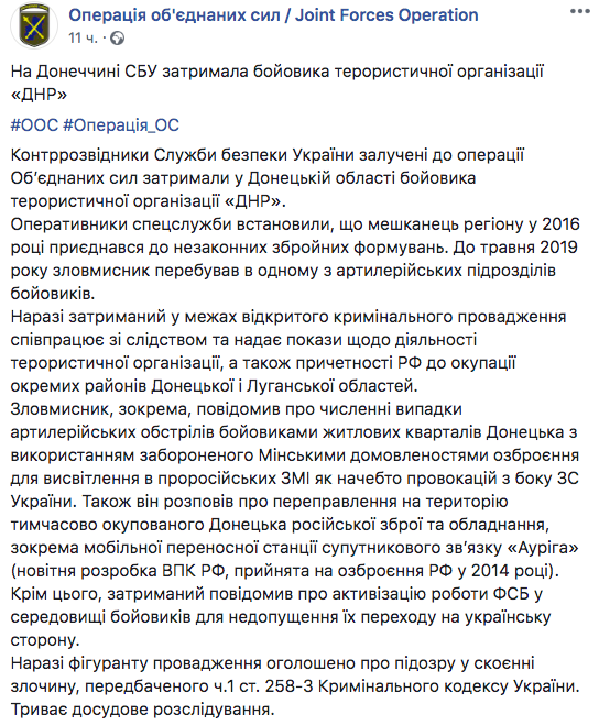 О задержании очередного террориста рассказала в Facebook пресс-служба штаба ООС, передает "Диалог.UA".