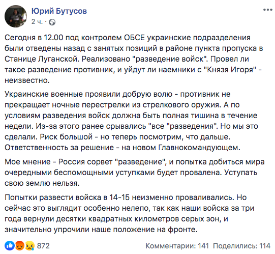 Своим неутешительным прогнозом о разведении войск Бутусов поделился в Facebook, передает "Диалог.UA".