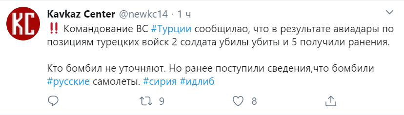 Авиация российско-сирийской группировки нанесла военно-воздушный удар по окрестностям базы турецких войск. Сообщение об ударе авиации в Твиттере сообщил Кавказ-центр.