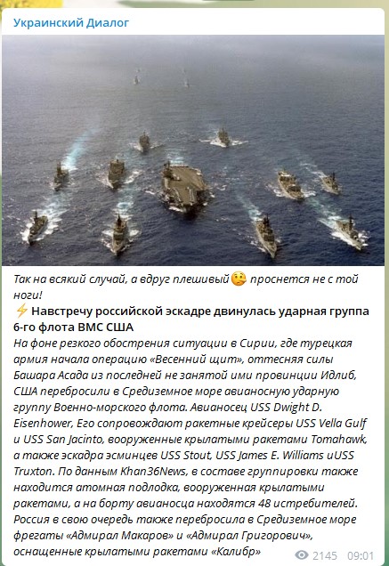 Более того, Россия, невзирая на угрозу втянуться в полномасштабную Третью мировую войну, продолжает дальше перебрасывать дополнительные силы и средства в Сирию и поддерживать диктатора Башара Асада. Так, фрегаты "Адмирал Григорович" и "Адмирал Макаров" успешно прошли пролив и отправились к берегам охваченной войной Сирии. В штабе Черноморского флота РФ объяснили: это усиление действующей группировки российских войск.