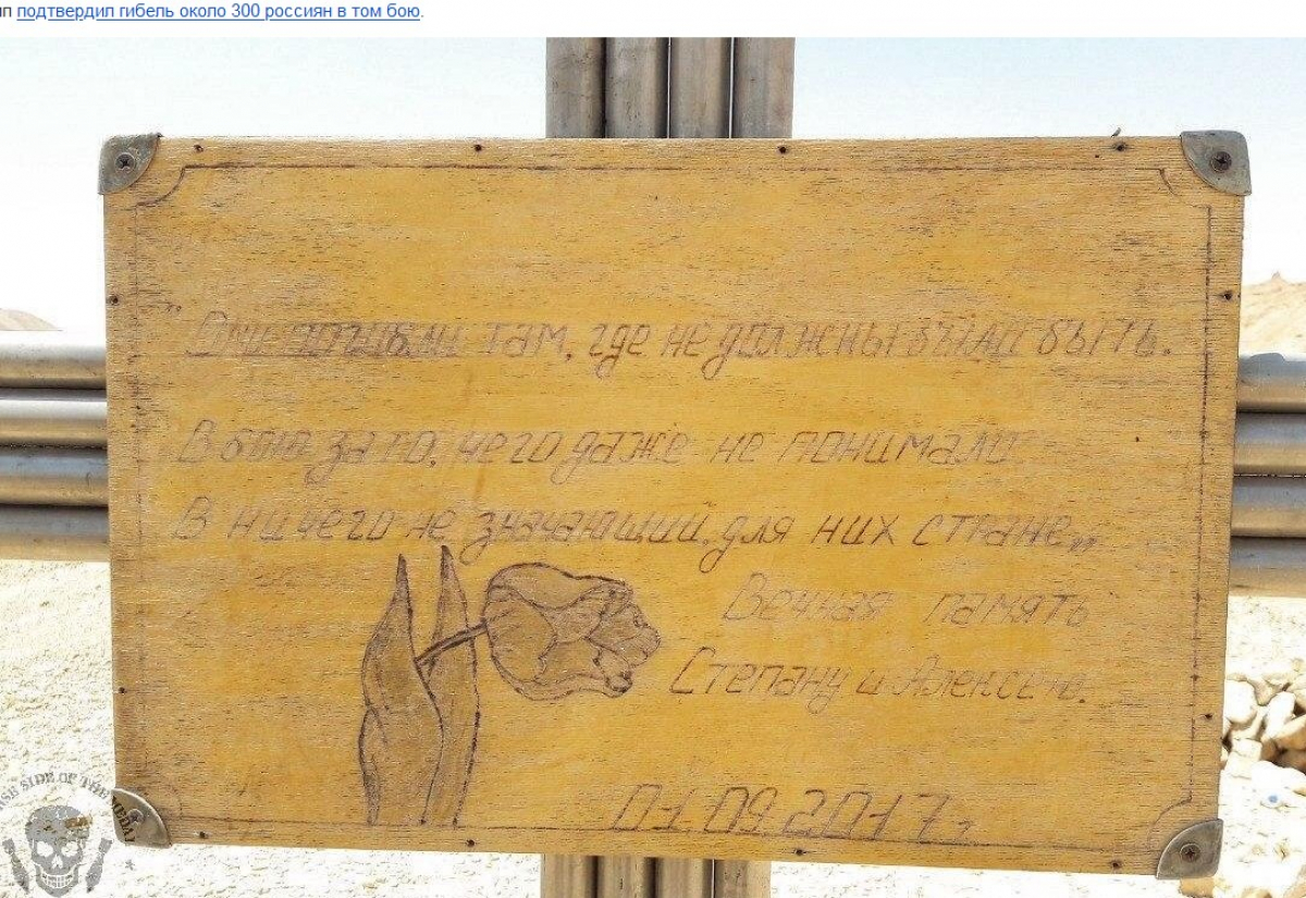 Табличка датирована 1 сентября 2017 года. Судя по этой дате, данные наемники могли погибнуть под Дейр-эз-Зором при авиаударе войск США. Сам президент Соединенных Штатов Дональд Трамп подтвердил гибель около 300 россиян в том бою.