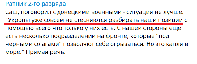 "Поговорил с донецкими военными - ситуация не лучше. "Ук***ы уже совсем не стесняются разбирать наши позиции с помощью всего, что только у них есть. С нашей стороны еще есть несколько подразделений на фронте, которые "под черными флагами" позволяют себе огрызаться. Но это капля в море. Прямая речь", - пишет он.
