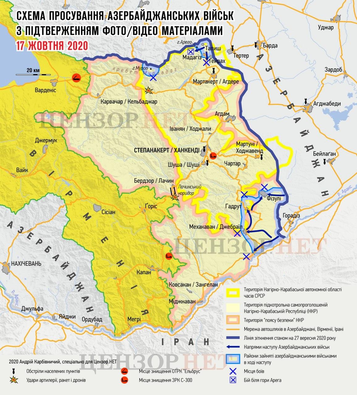 В свою очередь, журналист и военный эксперт Юрий Бутусов опубликовал на своей странице в социальной сети Facebook карту Нагорного Карабаха с расстановкой сил по состоянию на 17 октября.