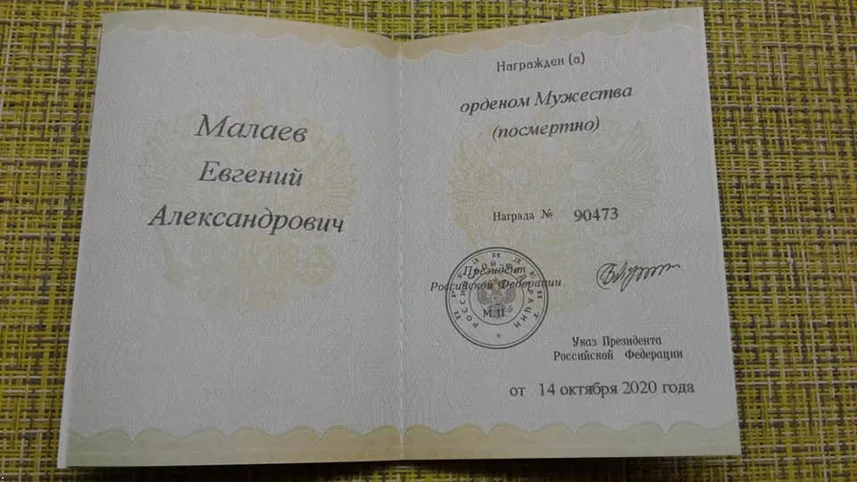 Удостоверение о награждении орденом за "мужество" выдано специальным указом российского президента Владимира Путина.