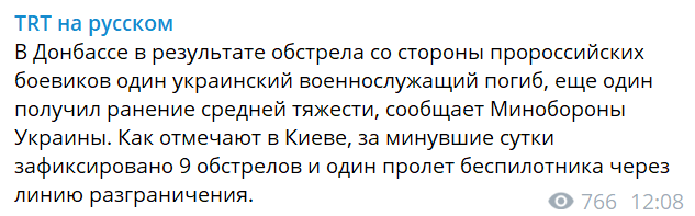 Публикуя сводку с фронта турецкое агентство TRT (его русскоязычная версия) сообщило о гибели украинского военнослужащего в результате обстрела со стороны российских наемников, прямо указывая на российское происхождение оккупантов.