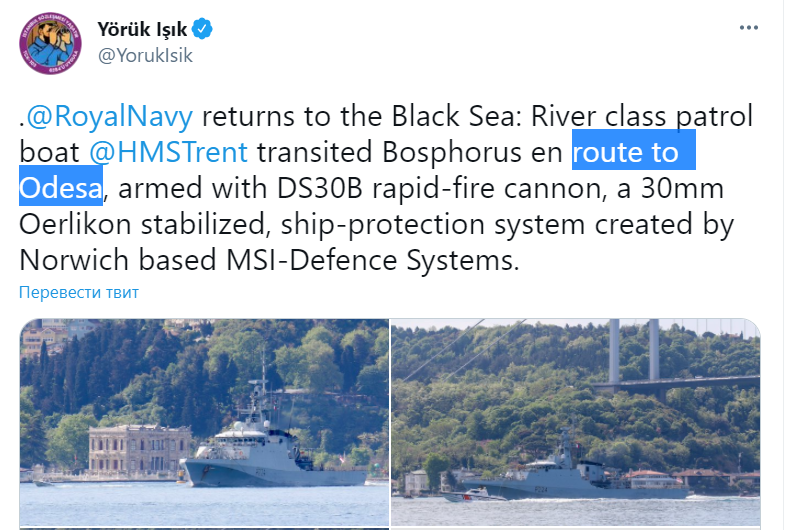 При этом турецкие журналисты отмечают, что британский военный корабль направляется в порт Одессы. Информацию об этом сообщил турецкий обозревать, который публикует на своей странице в социальной сети Twitter мониторинг прохождения Босфора морскими судами.