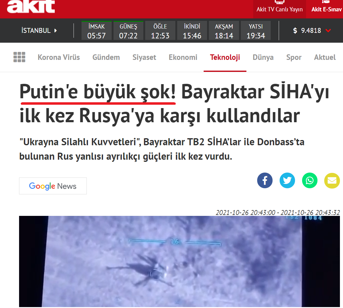 "Большой шок для Путина! Bayraktar TB2 впервые использован против России", - отмечено в заголовке материала турецких СМИ.