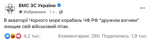 “В акватории Черного моря корабль ЧФ РФ (Черноморского флота РФ - ред.) “дружественным огнем” уничтожил свой военный самолет”, - сообщили военные.