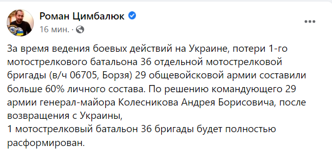 "За время ведения боевых действий в Украине потери 1-го мотострелкового батальона 36-й отдельной мотострелковой бригады (в/ч 06705, Борзя) 29-й общевойсковой армии составили больше 60% личного состава. По решению командующего 29-й армией генерал-майора Колесникова Андрея Борисовича, после возвращения из Украины 1-й мотострелковый батальон 36-й бригады будет полностью расформирован", - отмечено в сообщении.