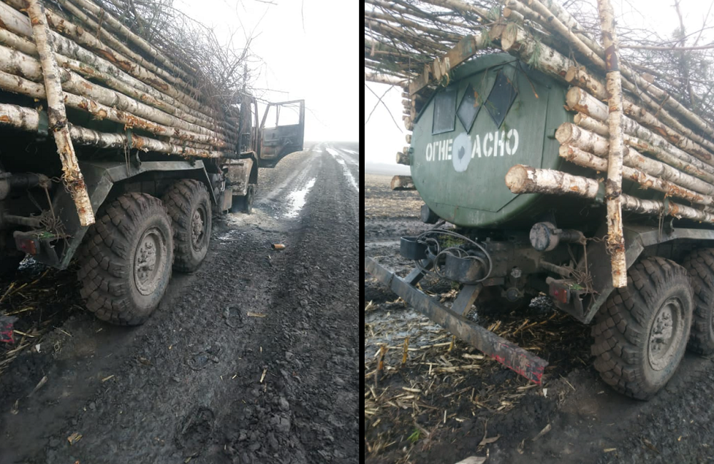 Отдельное внимание в ВСУ обратили на попытку российских военных замаскировать бензовоз деревянными бревнами с целью избежать уничтожения оперативного запаса топлива. На опубликованной фотографии бензовоз, кузов которого с обоих боков и сверху перекрыт рядами деревянных брусьев.