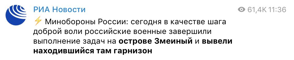 Министерство обороны России сделало официальное заявление про отступление с острова Змеиный, откуда после ночного ракетного удара ВСУ выжившие россияне были вынуждены эвакуироваться. Российские информационные агентства отмечают, что, согласно сообщению МО РФ, российские военные сбежали с острова "в качестве жеста доброй воли".