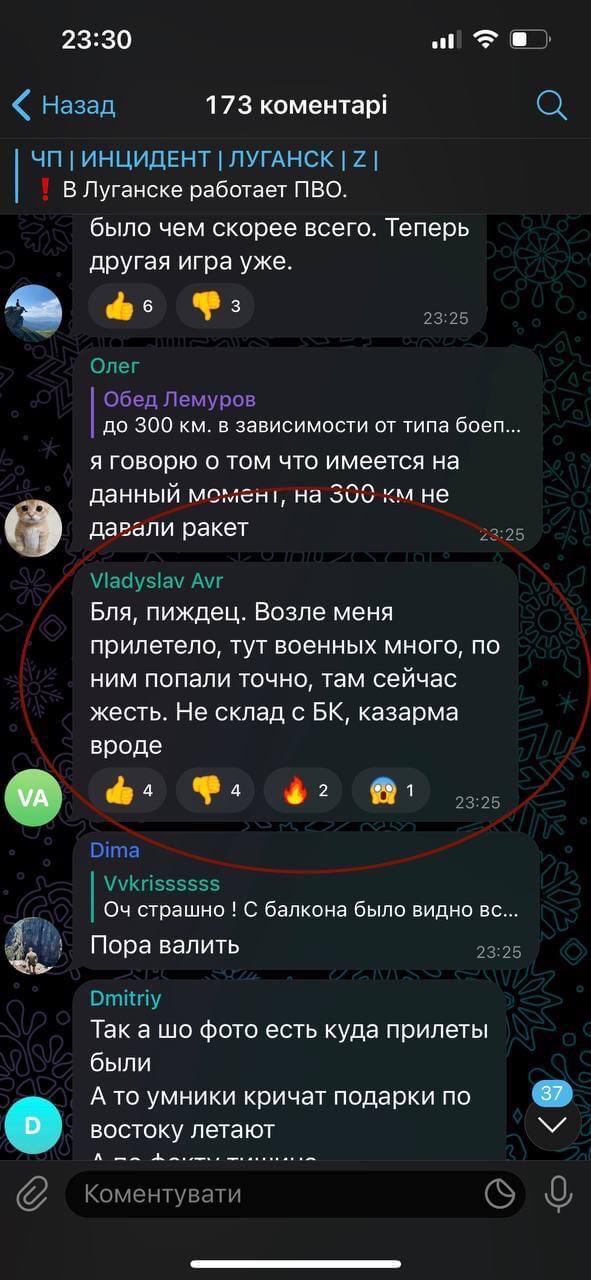 Горожане говорят, что еще никогда не слышали взрывов, похожих на ночные. Со слов луганчан, удар пришелся по объекту, где всегда были "военные" формирования "ЛНР": "Там сейчас жесть. Не склад с БК, казарма вроде", "Сильных 4 взрыва один за одним, даже дом вздрогнул, из окон ничего не видно, но что-то машины носятся по дороге", "Раз***али склад по ходу, там сегодня еще куча вояк была!"
